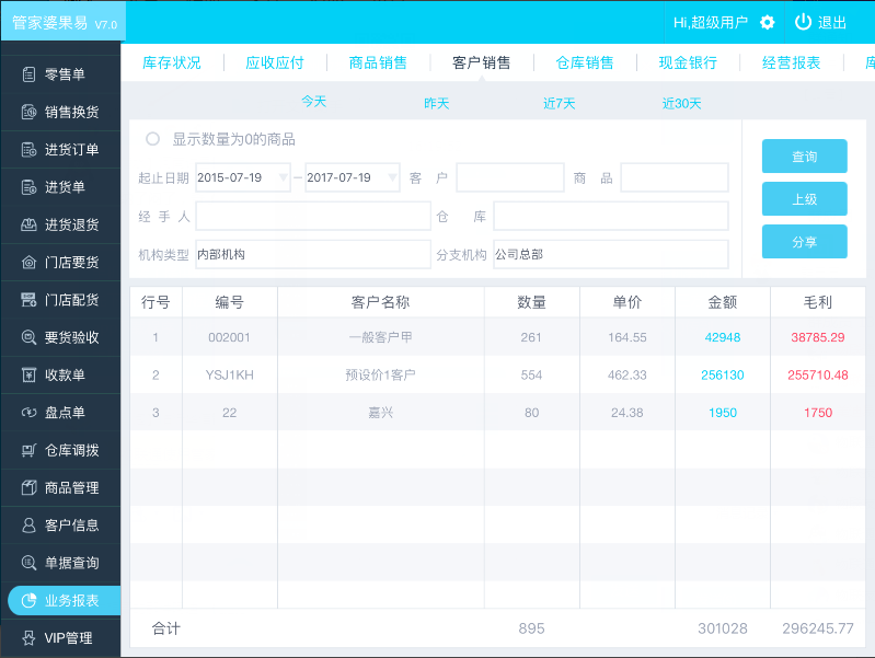果易–商品/客户/库存销售 By admin | 2017年7月19日 - 下午4:24 |2017年7月19日 物联通服务器说明 1.商品销售,可自定义查询某客户/产品/经手人/仓库的某时间段内的销售数据。包含:销售数量、销售均价、销售金额、毛利和他们的合计数据。 2.客户销售报表,可自定义查询某客户/产品/经手人/仓库的某时间段内的销售数据。包含:销售数量、销售均价、销售金额、毛利和他们的合计数据。 3.仓库销售报表,可自定义查询对应仓库的某时间段内的销售数据。包含:销售数量、销售均价、销售金额、毛利和他们的合计数据。 Bookmark the permalink.