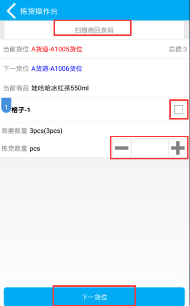 当前货位上的商品全部拣货完成后,点击下一个货位;进行下一个货位的拣货;当该单据的所有货位、所有商品都拣货完成后,点击提交,提交成功后;即可完成了该单据的拣货