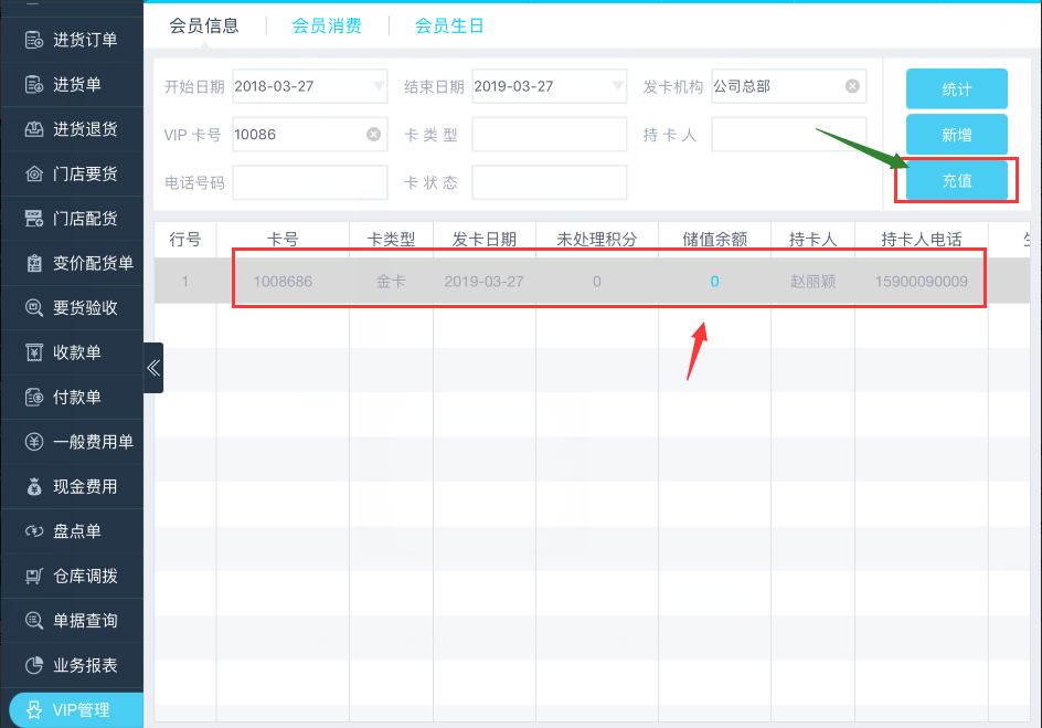 会员储值 By admin | 2019年3月27日 - 上午10:37 |2019年3月27日 物联通服务器说明 会员储值,应用于,平板端直接给会员卡进行充值操作; 操作方式: 平板端,登录进去,点击【VIP管理】,找到【会员信息】,通过【会员卡】的查询条件, 查找到具体的会员卡后,点击一次这个会员卡,再点击【充值】按钮, 即可进行会员充值的操作; 录入好【储值机构】、【收款账户】、【收款金额】、【优惠金额】信息后,点击【完成】,提示充值成功即可;如下图: Bookmark the permalink.