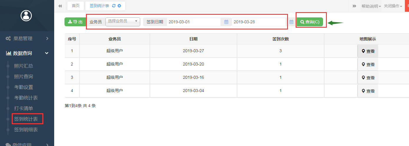 果易后台网页端–【数据查询】–【签到统计】,通过时间段等筛选条件,进行查询;如下图:
