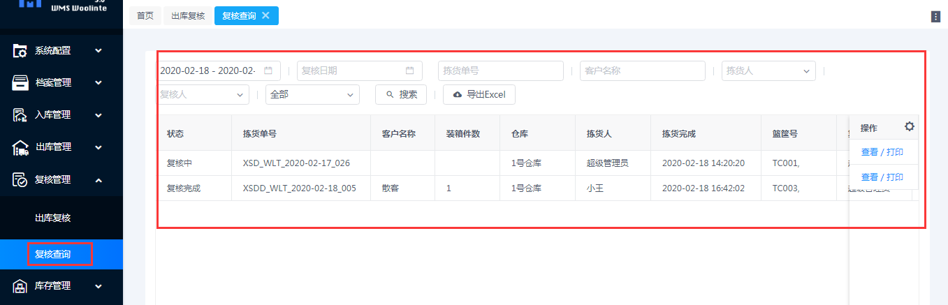 在WMS后台—-复核管理—-复核查询,中通过筛选条件,即可查询:
