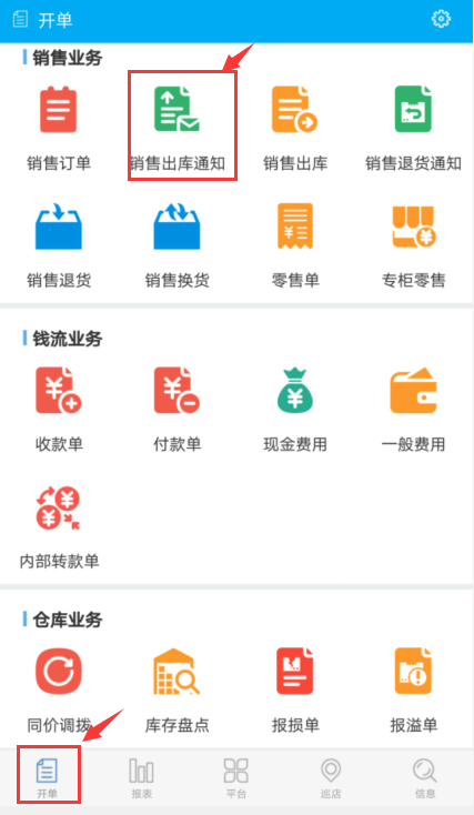 在app端, 在开单模块,找到【销售出库通知单】,即可开单