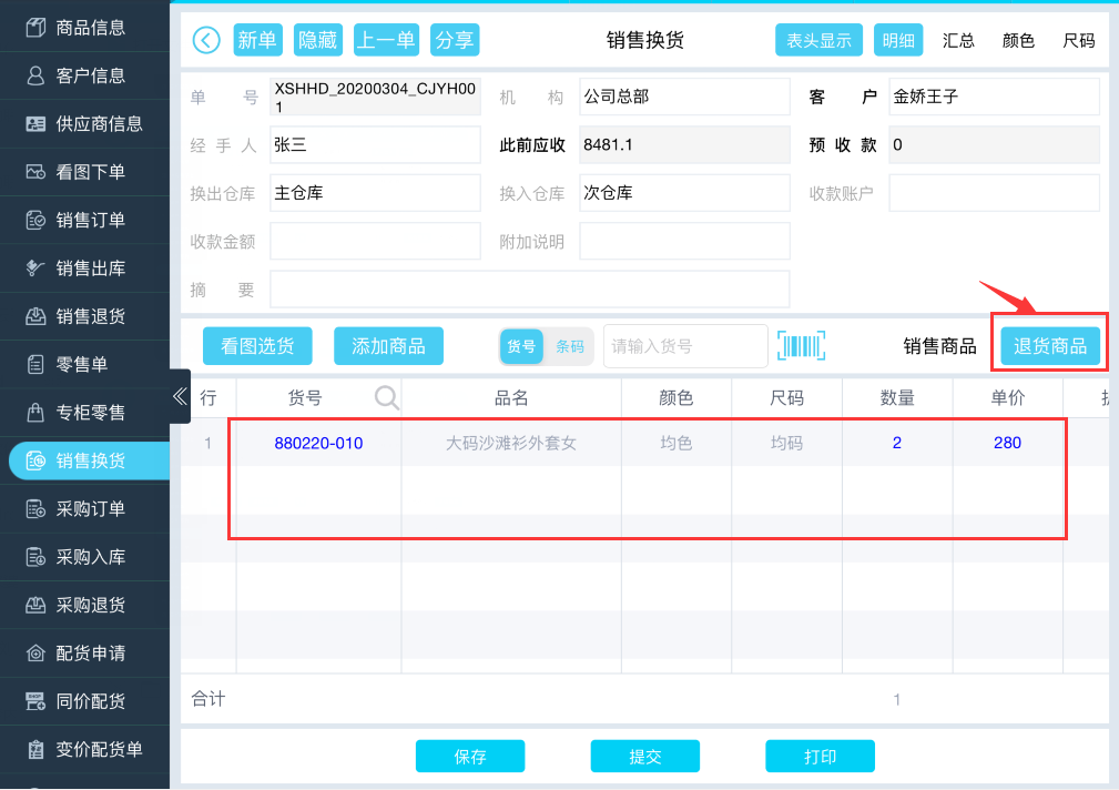 销售退换货的商品都无误后, 提交到管家婆软件中;如下图:
