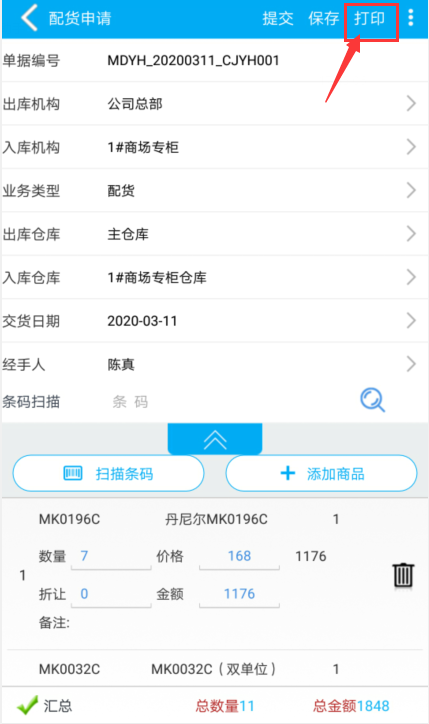 单据开完后,可以进行【保存】、【提交】、【打印】;