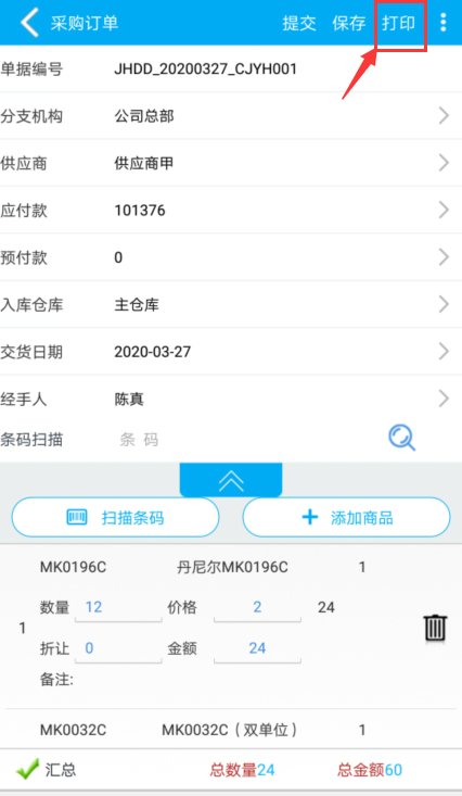 单据开完后,可以进行【保存】、【提交】、【打印】;